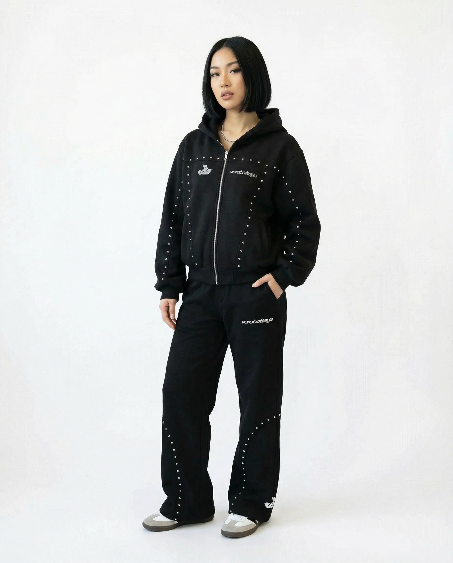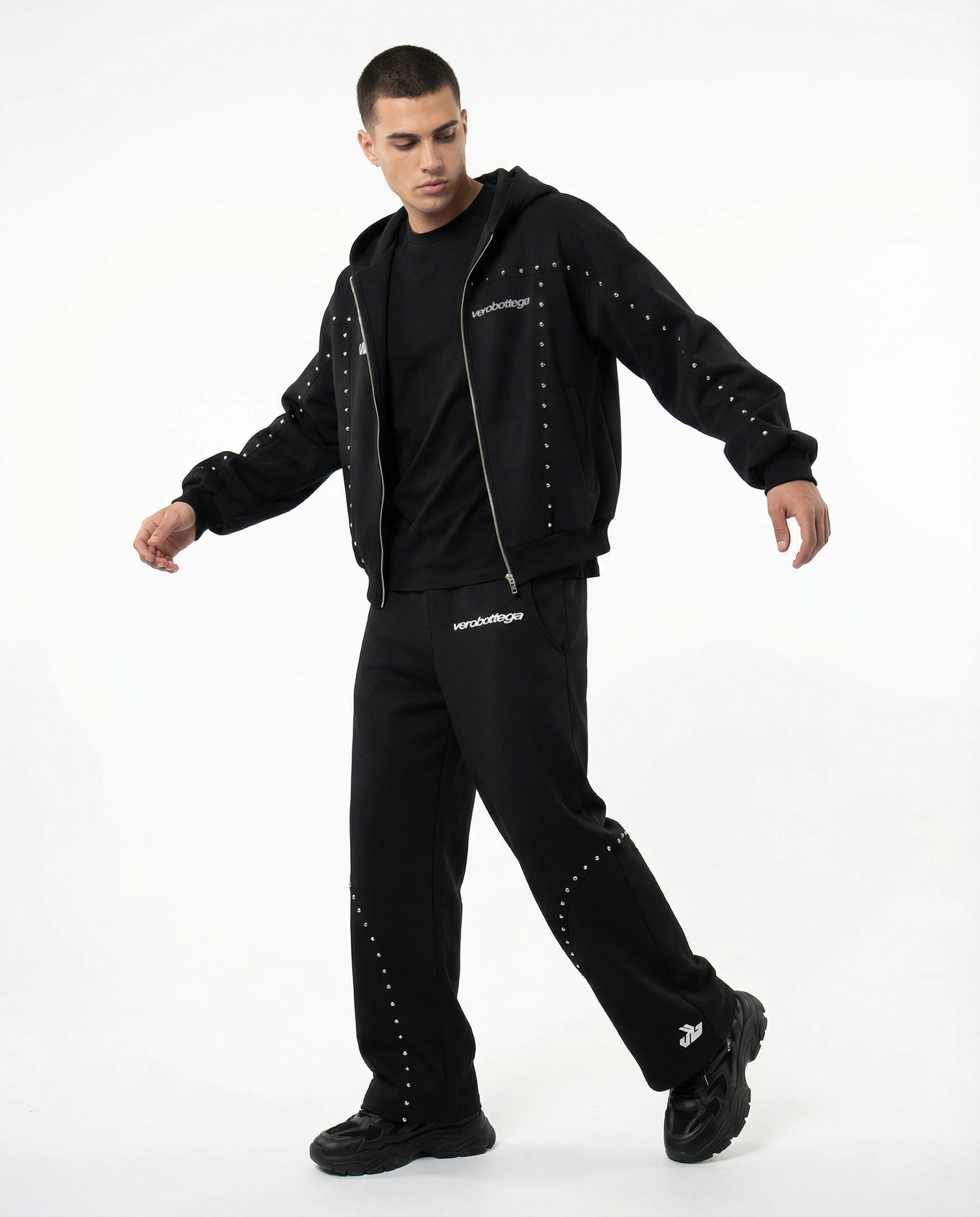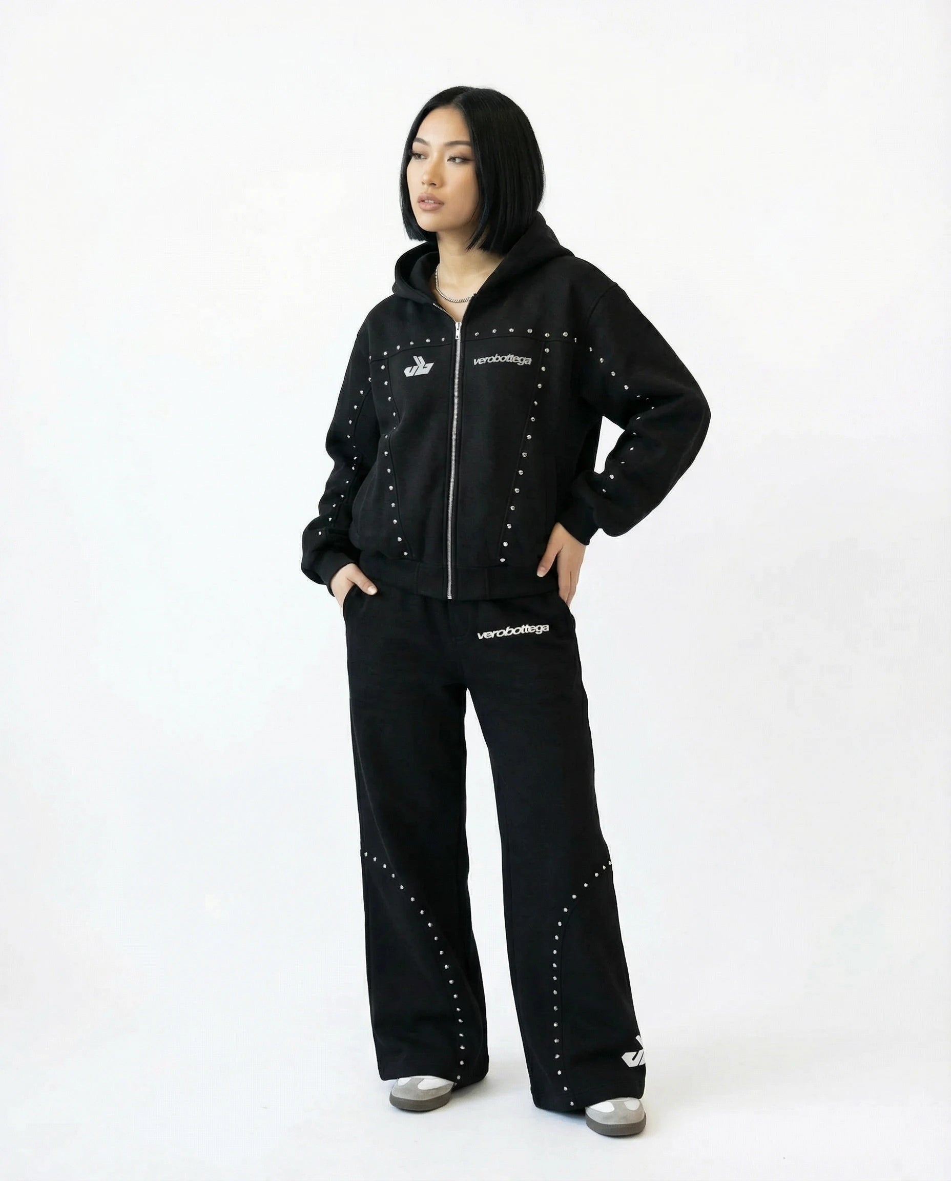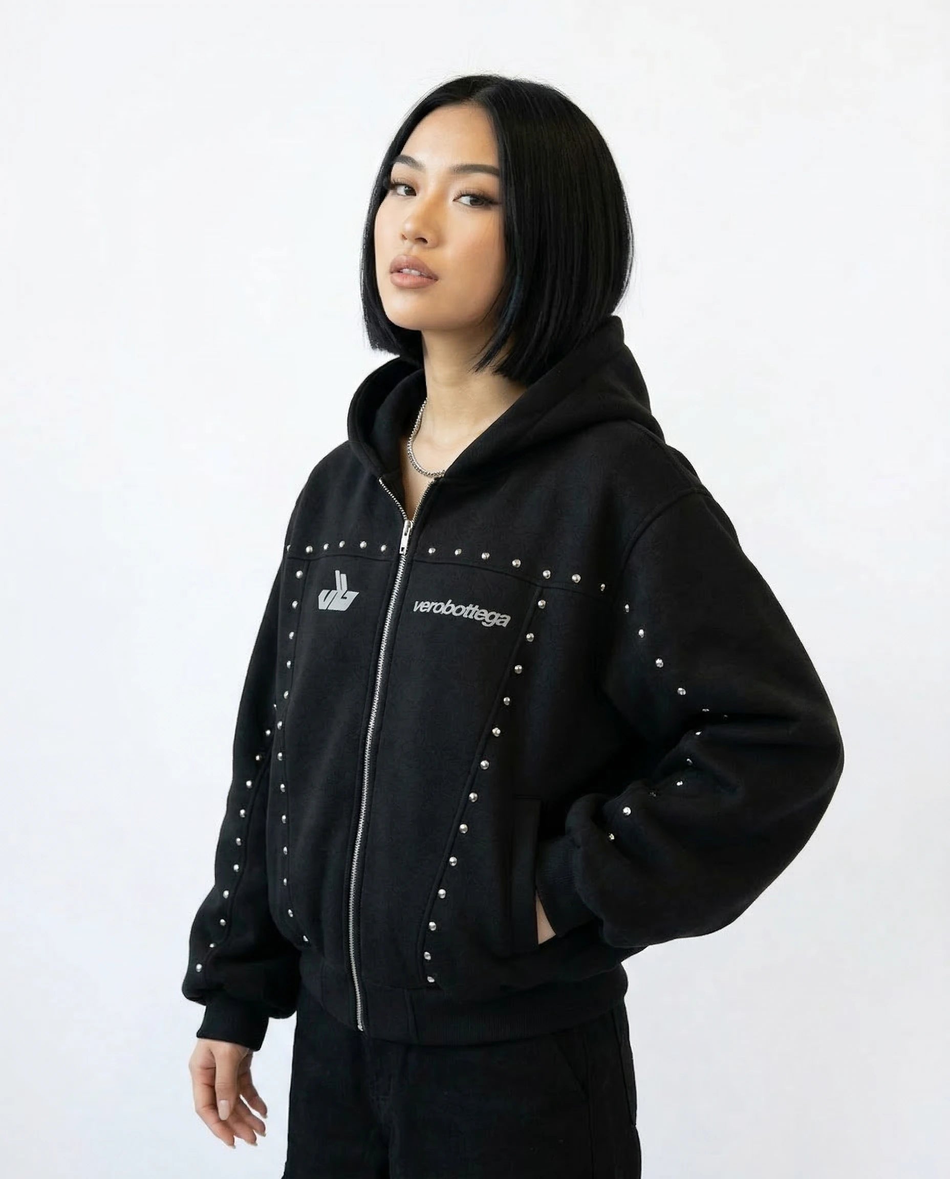 Two-Tone tracksuits carefully crafted at each seam, metal studs, Full Metal Zipper, Oversized 3 panel-hood, Jumbo/Reg DTG prints, Ribbed cuffs and hem.
